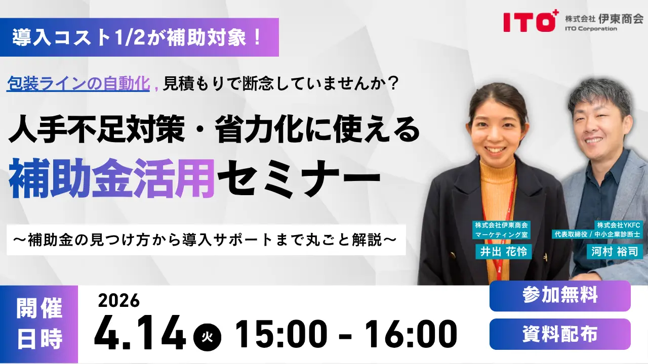 4/14開催Webセミナー「人手不足対策・省力化に使える 補助金活用セミナー」のお知らせです。